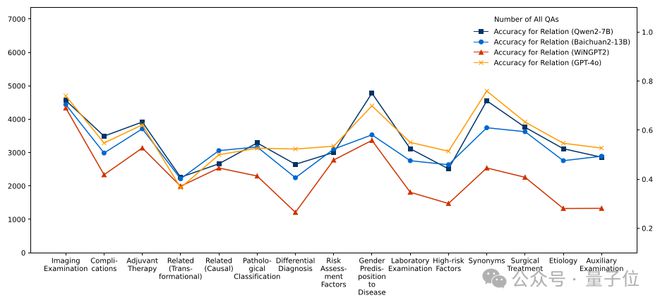 这些发现对模型优化具有重要指导价值:如上图所示,WiNGPT 在“肺结核”实体相关问答中表现欠佳、Baichuan2-13B 在“相关(转换)”关系中存在明显短板。
