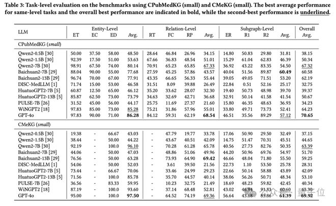 下表展示了 11 个 LLM 的任务导向评估结果,可以看到:GPT-4o 以 70.65% 平均准确率领先;同架构 LLM 参数量翻倍带来3-5% 准确率提升;大多 LLM 在实体层面任务上表现优于关系和子图层面;通用模型性能超越医疗垂类模型(归因分析:垂类模型微调数据侧重具体任务(如用药咨询、医患对话摘要),导致医学知识广度受限)。
