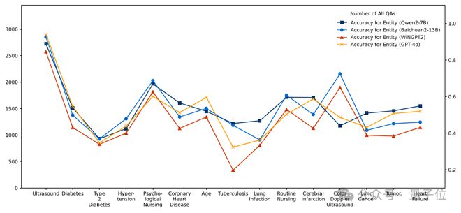 以常用临床实体“超声”为例,可以看到 GPT-4o 以 94.16% 正确率领先,Qwen2-7B(88.83%)、WiNGPT2(85.41%)次之。