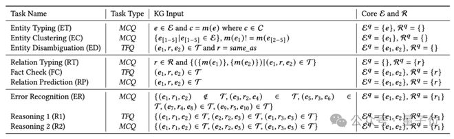 在每项任务中均配备评估核心实体/关系映射(如上图 core E and R),实现细粒度知识覆盖分析:
