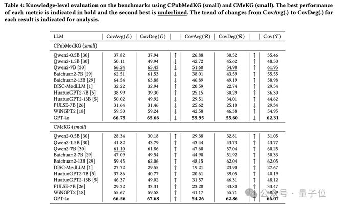下表展示了 11 个 LLM 的知识导向评估结果,可以看到:GPT-4o 在 CPubMedKG (small)上覆盖了 65.66% 的实体、55.60% 的关系、62.31% 的三元组;更大的参数量通常会带来更高的知识覆盖度;CovAvg 和 CovDeg 的对比体现出了 LLM 对高关联度实体(如糖尿病)和高频关系(如鉴别诊断)的偏好性:CovAvg < CovDeg 说明 LLM 在高关联度实体的上表现更好、反之说明 LLM 在低关联度实体上表现更好。