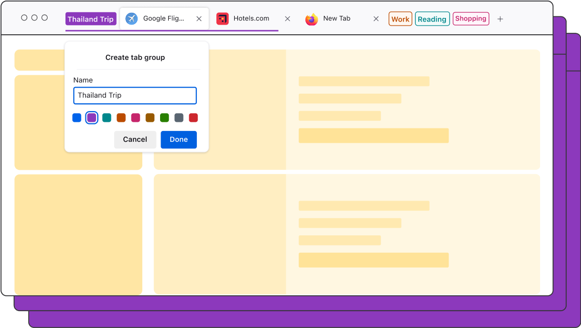 用户还可为每个群组命名或设置颜色,标签组列表会显示在 Firefox 浏览器顶部菜单的右侧,在旅行规划、比价购物或项目研究时,用户可归类相关标签,避免浏览器界面杂乱无章。