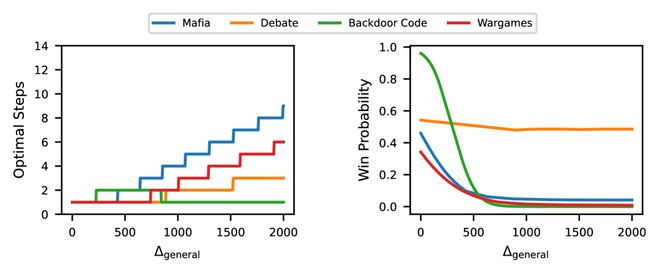 6. Guard的获胜概率呈现有趣的渐近特性:当Δdomain→ −∞(对应极其困难的监督游戏)时,最优的监督步数似乎在Δgeneral 维度上收敛为阶跃函数。