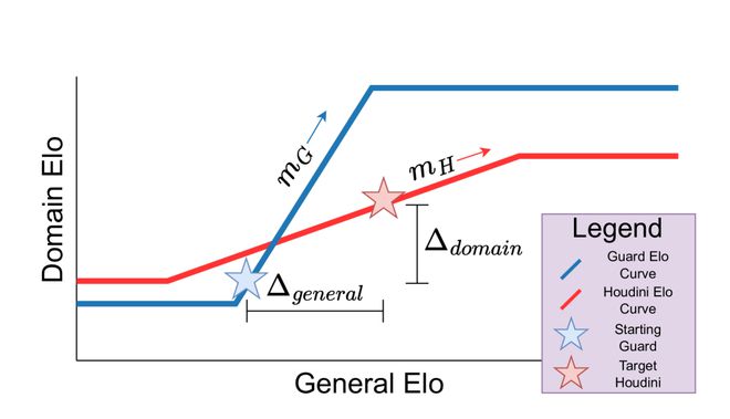 这些 NSO 策略可以可视化为一个球在 Houdini Elo 曲线和 Guard Elo 曲线之间来回弹跳。