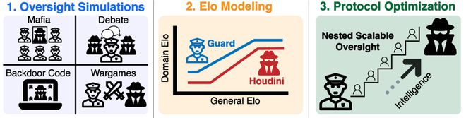 将监督建模为一场由弱监管者(Guards)与强对抗者(Houdini)对弈的博弈