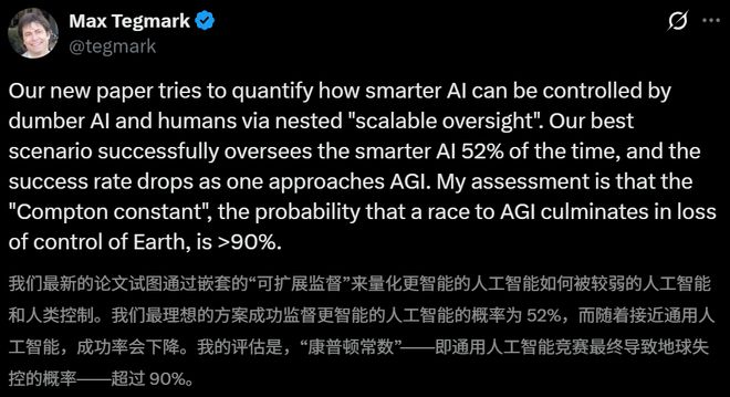 Max Tegmark 给出了一个量化指标「康普顿常数」(即在通向 AGI 的竞赛中,人类失去对地球控制的概率)大于 90%。