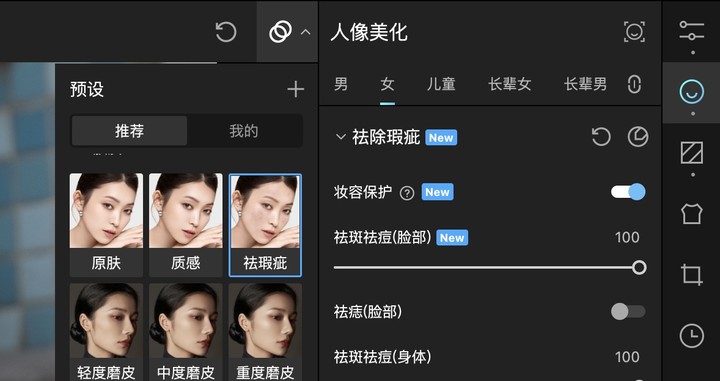 在识别了原图的人像主体之后,我们可以在祛除瑕疵分类项里找到「妆容保护」的开关,一键打开之后就可以在使用磨皮、祛瑕疵等人像美化功能的时候,妆容的细节与色彩都能够完整保留。
