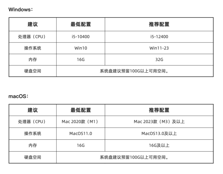 而 macOS 就直接推荐使用 Apple Silicon M 系芯片,推荐配置是 M1 及以上芯片;(统一)内存在 16GB 以上,系统盘也是建议预留 100GB 以上空间。