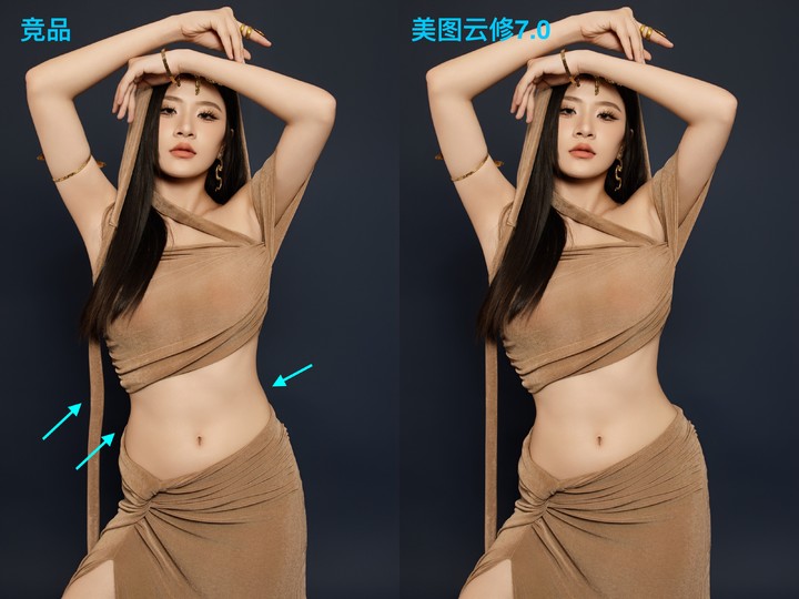为了可以更针对性地处理好体态的矫正,美图云修 Pro 在 7.0 版本里,新增了驼背、瘦肩膀、瘦肚子等数项针对性的美型功能——这些都是「人无我有」的自研首发功能,而且瘦腰和修复驼背的时候也不会对衣服和背景产生明显影响。