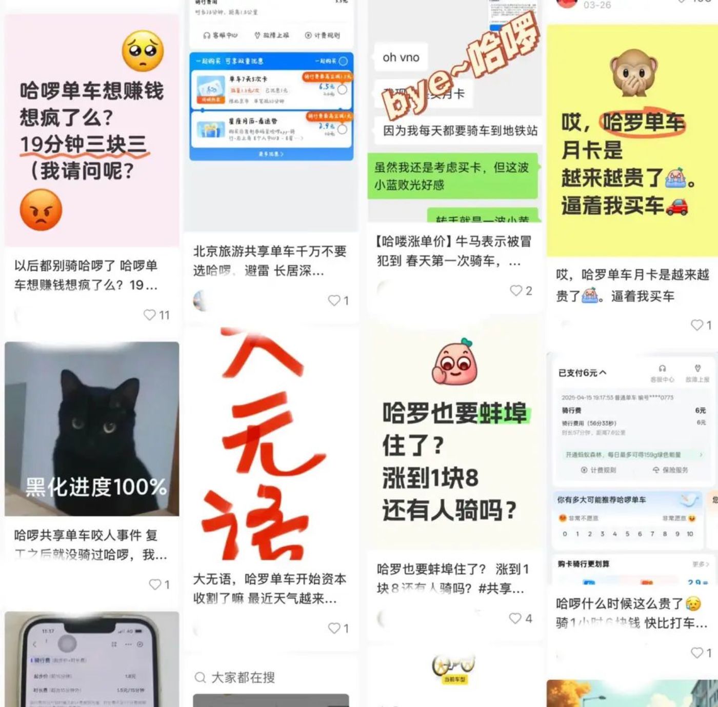 这不是王淼一人的无奈。在社交平台,关于“哈啰单车涨价”的吐槽不胜其数。有网友表示,“避雷哈啰(单车),节假日还涨价”、“这是要逼着我买车”......