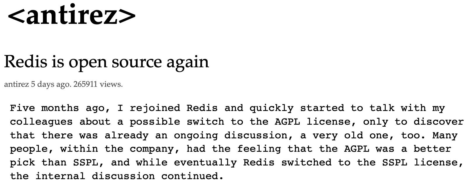 Redis 创始人亲自宣布该消息后,发文总结了此次切换 Redis 开源许可证的一些心得。