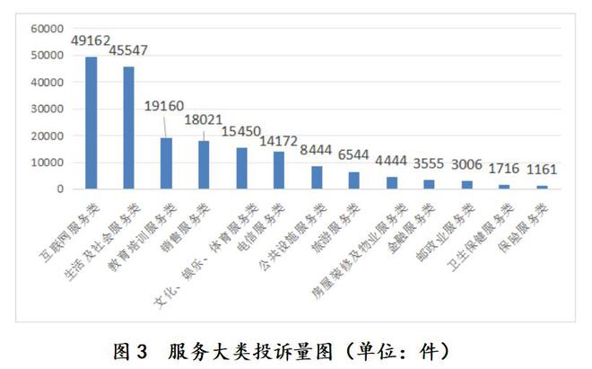 根据 2025 年一季度内服务大类投诉数据,互联网服务类,生活及社会服务类,教育培训服务类,销售服务类,文化、娱乐、体育服务类居于前五位。与 2024 年一季度相比,金融服务类,文化、娱乐、体育服务类,公共设施服务类投诉量比重上升;生活及社会服务类,互联网服务类,电信服务类投诉量比重下降。