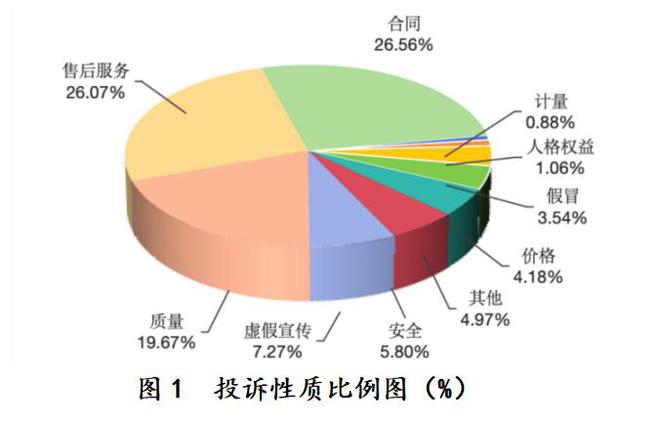 根据投诉性质,合同问题占 26.56%,售后服务问题占 26.07%,质量问题占 19.67%,虚假宣传问题占 7.27%,安全问题占 5.8%,价格问题占 4.18%,假冒问题占 3.54%,人格权益问题占 1.06%,计量问题占 0.88%,其他问题占 4.97%。