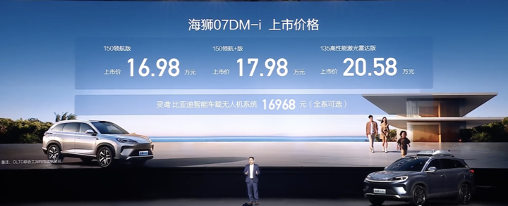 比亚迪海狮 07 DM-i 刚刚上市了,三款配置的最终售价都下调了 2 万元,区间为 16.98 万元—20.98 万元,同时也都可花 16968 元选装灵鸢智能无人机。