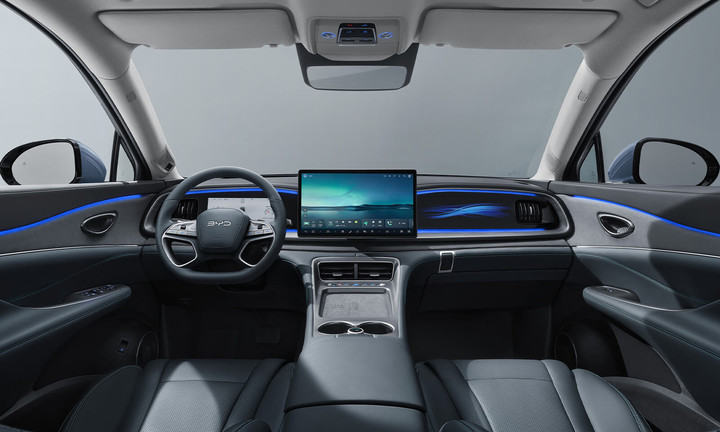 进入到车内,海狮 07 DM-i 的「冰川世界」仪表台采用了对称式布局,10.25 英寸全液晶仪表则嵌入进了一整块贯穿的黑色面板中,同时也配备了 15.6 英寸的悬浮中控屏和 HUD 抬头显示。