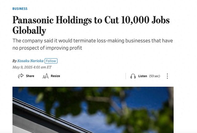 5 月 9 日,据《华尔街日报》消息,松下计划在全球范围内裁员约 1 万人,同时审查每个集团公司的运营效率。