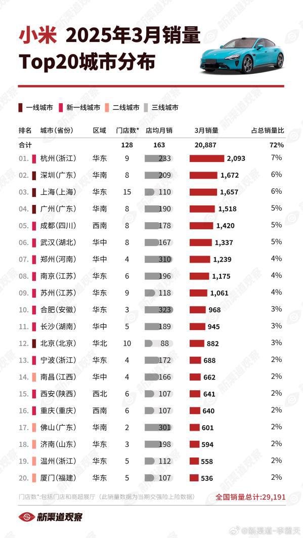 实际上,小米汽车销量分布也折射出中国新能源汽车市场的区域分化特征:一线城市仍是主力战场,但新一线城市正凭借产业基础和政策红利成为新增量来源。