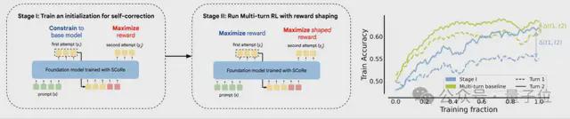 Kumar 等人(2024)开发的 SCoRe(Self-Correction via Reinforcement Learning)采用多轮次强化学习策略,通过激励模型在第二次尝试时生成优于首次尝试的答案来实现自我修正。该框架包含两个训练阶段: