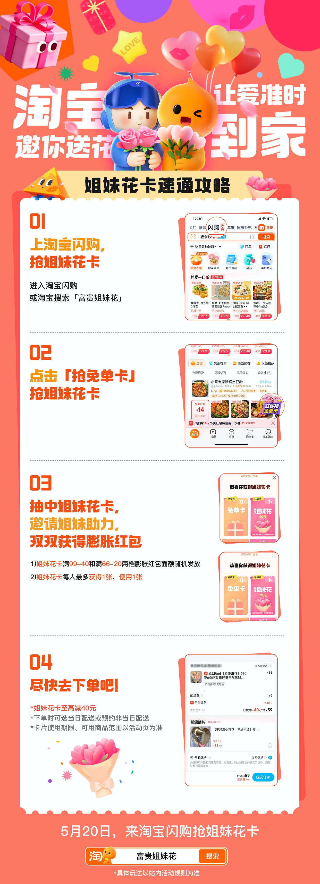 5 月 20 日,淘宝闪购全新推出「姐妹花」卡。用户在淘宝 APP 搜索 “富贵姐妹花”,或者进入淘宝闪购频道,点击页面右下角浮标 “抽免单”,即可参与抽取「姐妹花」卡。