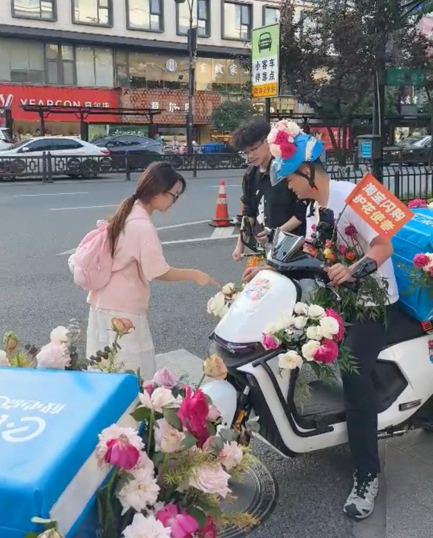 临近 520,还有网友在社交媒体上晒出照片,看到淘宝闪购骑士在城市街头化身“护花使者”,头盔、衣服、后备箱上装满鲜花,将鲜花和心意传递给路人。