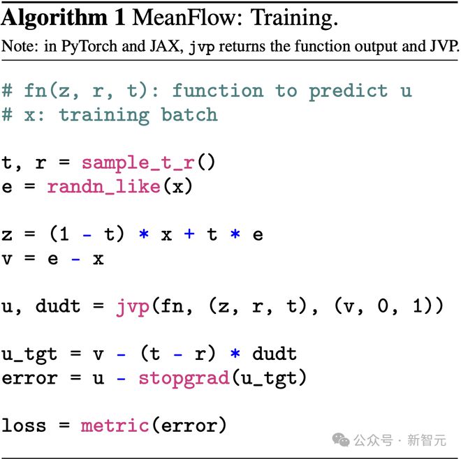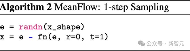 使用 MeanFlow 模型进行采样非常简单:只需将时间积分项替换为平均速度即可,伪代码详见算法2。