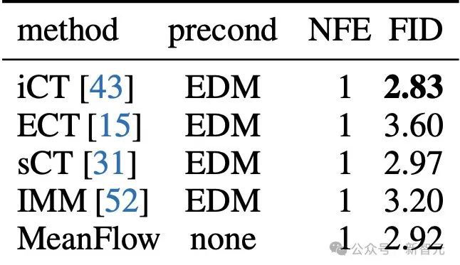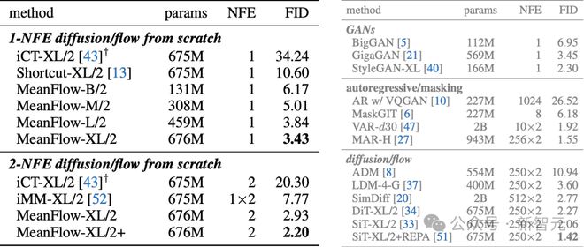 总体来看,MeanFlow 在同类方法中表现显著优越:
