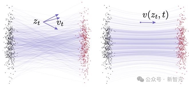 图2:Flow Matching 中的速度场示意图。左图:条件流(ConditionalFlows)。同一个z_t可能由不同的(x,ϵ)组合生成,因此会对应不同的条件速度v_t。右图:边缘流(Marginal Flows)。通过对所有可能的条件速度进行边缘化(求平均)得到边缘速度场。这个边缘速度场被作为训练神经网络时的「真实目标速度场」