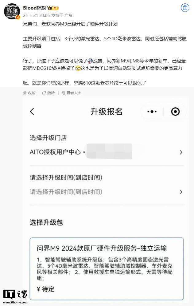 5 月 22 日消息,据多位博主 / 用户分享,老款问界 M9 汽车开启硬件升级报名,相关页面已上线,价格待定。升级包内容如下: