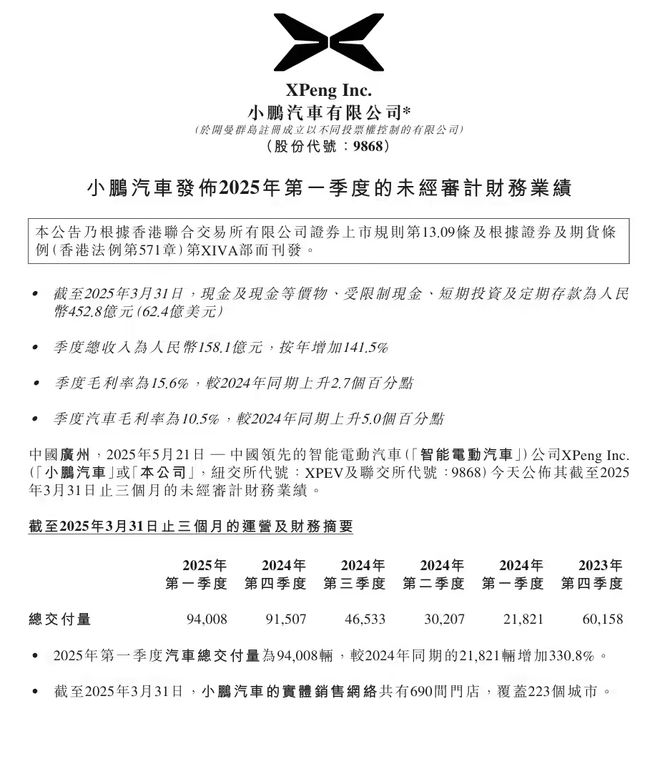 5 月 21 日,小鹏汽车在港交所公告,,第一季度营收 158.1 亿元,去年同期 65.5 亿元,同比增长 141.5%;第一季度净亏损 6.60 亿元,相较去年同期 13.7 亿元、上一季度 13.3 亿元明显收窄;第一季度调整后每股亏损 0.22 元。该季度汽车总交付量 94008 辆,相较去年同期 21821 辆大增 330.8%。预计第二季度营收 175 亿元人民币至 187 亿元人民币;交付量 10.2 万至 10.8 万辆,同比增 237.7-257.5%。