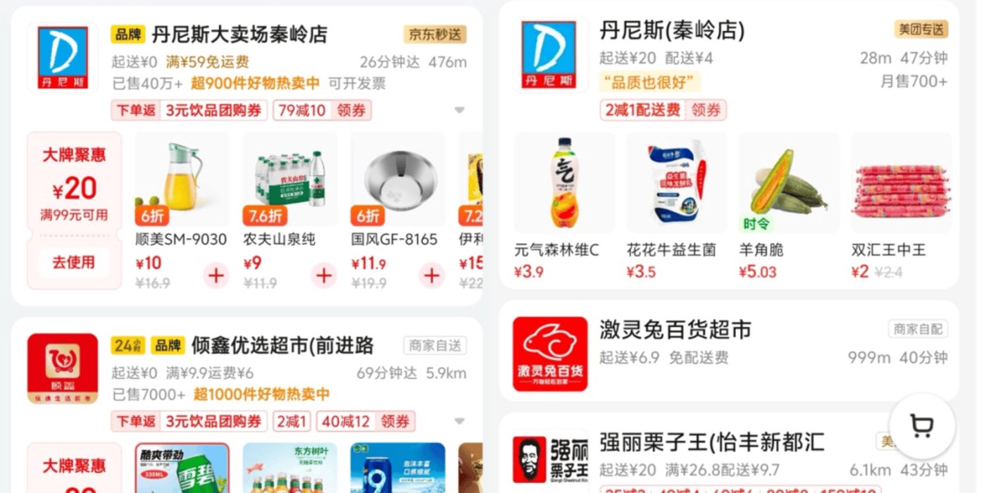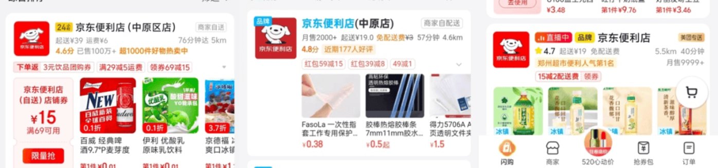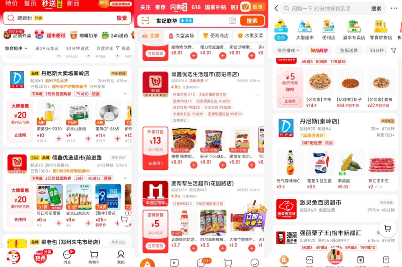 (左为美团闪购、中为京东秒送、右为淘宝闪购)