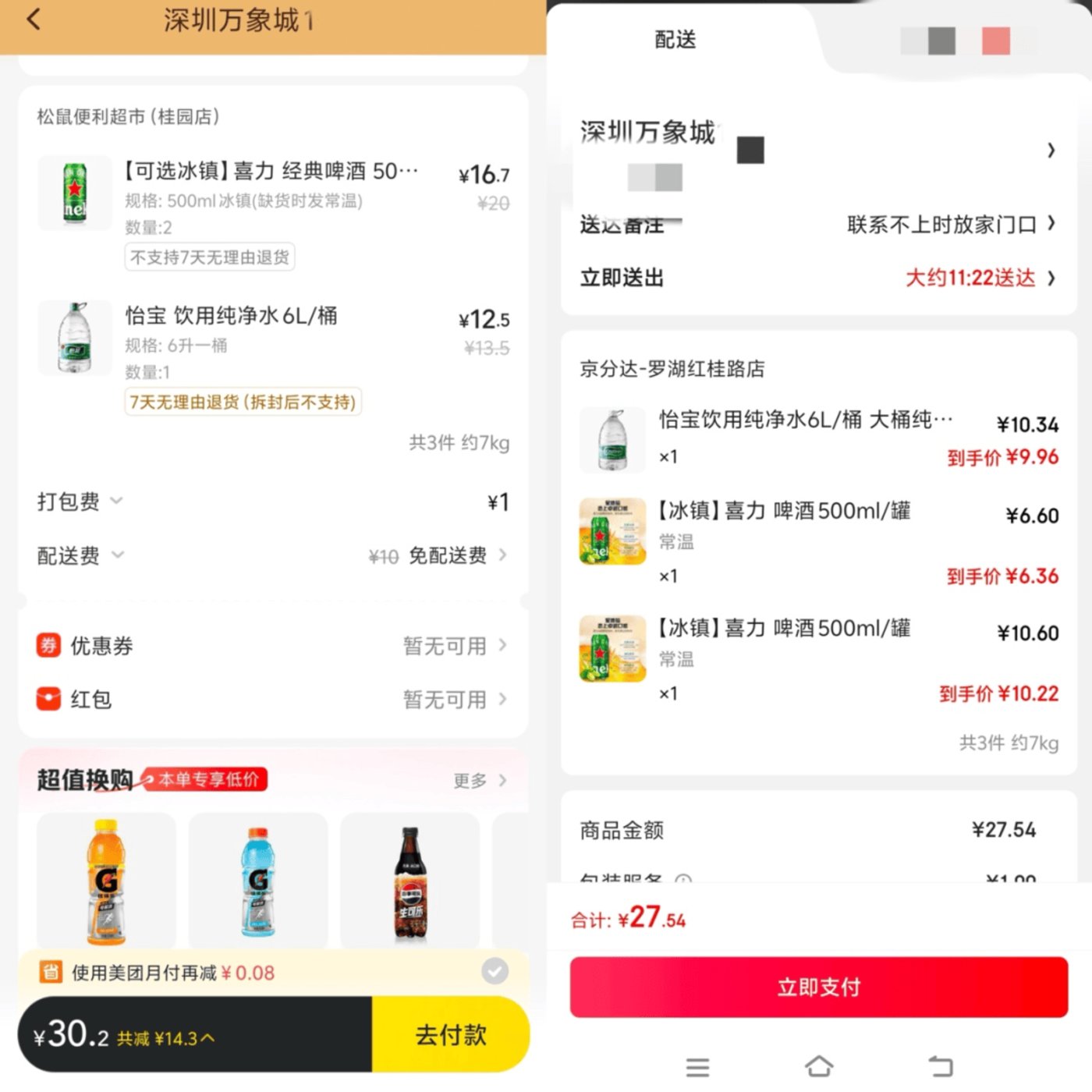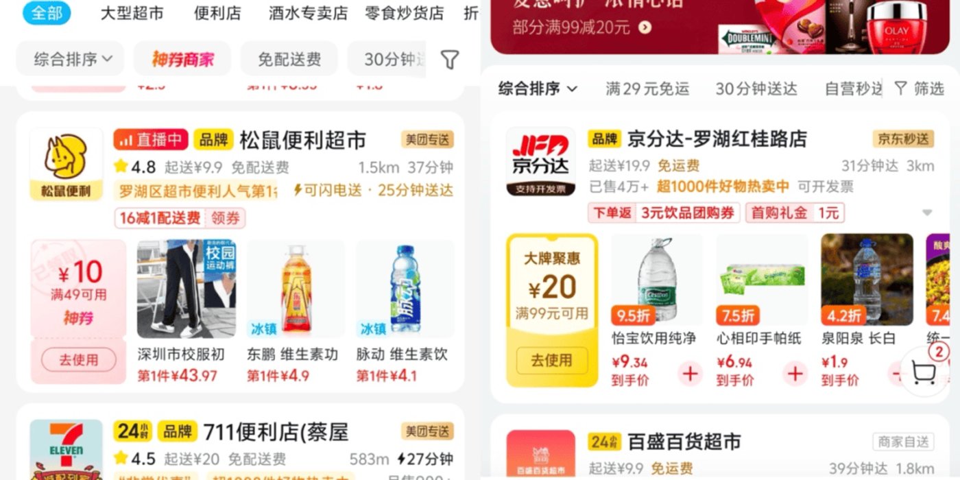 以深圳为例,《财经故事荟》以“深圳万象城”为定位,在京东秒送上的“京分达-罗湖桂红路店”显示预计配送时长 31 分钟,当天还有“满 59 减5”的全店券;而美团闪购的“松鼠便利超市桂园店”显示预计配送时长 37 分钟(闪电送 25 分钟达),当天有“满 49 减 10”的神券。