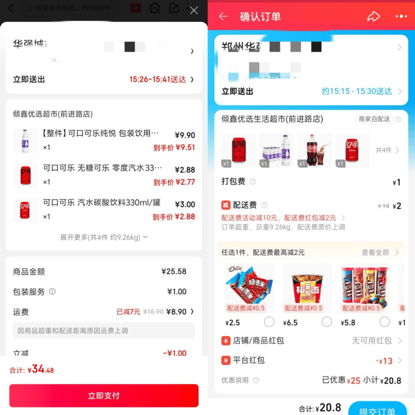 以 5 月 17 日郑州市中原区某小区为例,《财经故事荟》发现淘宝闪购的优惠券力度最大,除了“满 15 减 13“的外卖红包,还有“满 29 减5、满 59 减5”的店铺红包;美团闪购和京东秒送次之,前者当天有“满 25 减5“的神券,后者有”满 99 减 20“的大牌券和”满 3 减2“的百补券。
