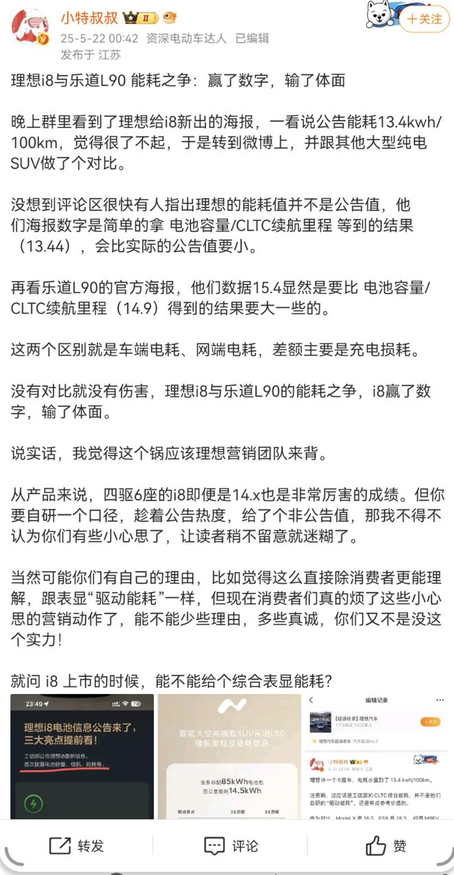 汽车博主“小特叔叔”指出,理想 i8 新海报宣传能耗 13.4kWh/100km 的数据是通过电池容量除以 CLTC 续航里程得出的,并非实际公告值。相比之下,乐道 L90 的官方能耗数据 15.4kWh/100km 大于其通过同样方法计算出的 14.9kWh/100km。理想 i8 虽在能耗数据上看似占优,但宣传方式不够透明,该博主认为是“赢了数字,输了体面”。