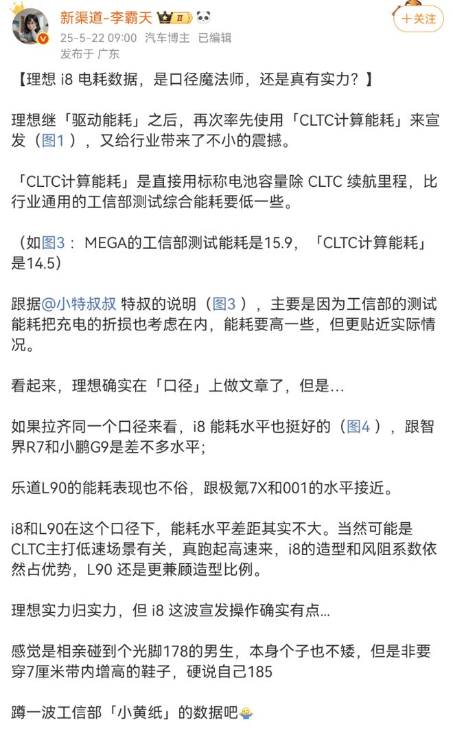 5 月 21 日,理想汽车昨晚公布了其首款纯电 SUV 车型 i8 的电池、电耗和续航信息,宣传其 CLTC 综合工况能耗低至 13.4 千瓦时 / 100 公里和 13.6 千瓦时 / 100 公里,但最后引发质疑。有博主指出该能耗值并非公告值,而是通过 “电池容量 / CLTC 续航里程” 简单计算得出,比实际公告值小。