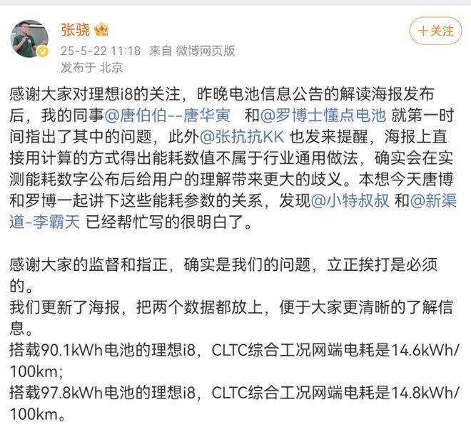 对此,理想汽车产品线负责人张骁回应,承认海报解读存在问题,更新海报将数据更正为 14.6 千瓦时 / 100 公里和 14.8 千瓦时 / 100 公里,并感谢监督。