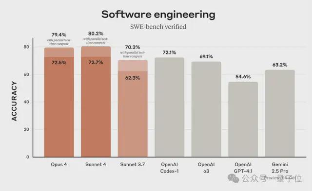 Claude Sonnet 4 其实也不差,它在 SWE-bench 上实现了 72.7% 的得分。