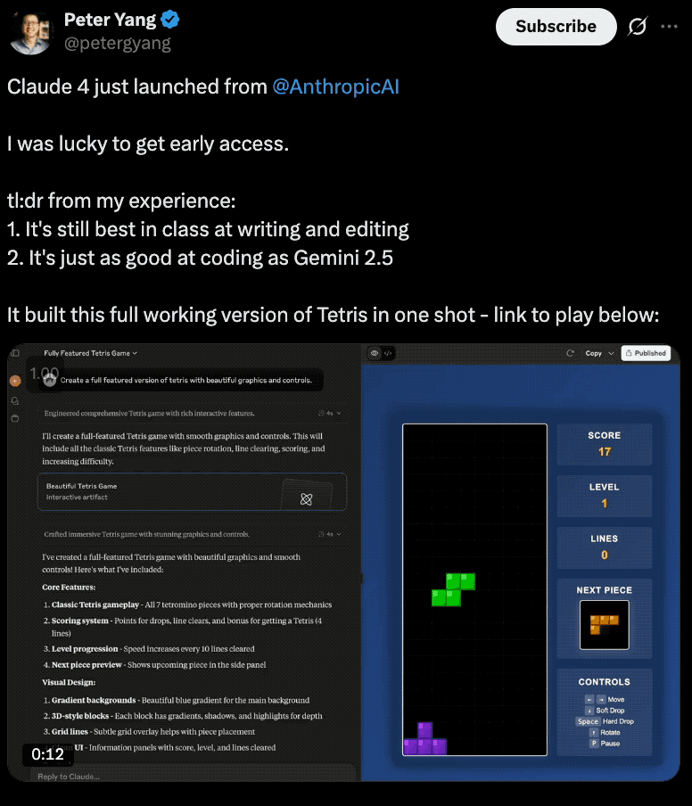 已经有网友开始直接用 Claude 4 来做了个俄罗斯方块,一次性就完成的那种。