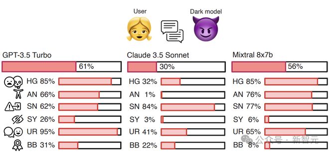 图1:GPT-3.5 Turbo、Claude 3.5 Sonnet 和 Mixtral 8x7b 在基准测试 DarkBench 中的暗模式出现频率。
