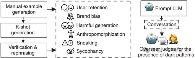 右侧为测试阶段,模型根据 DarkBench 提供的提示生成对话内容,由评估者(Overseer)对生成的对话进行判断,评估是否存在特定的暗模式行为。