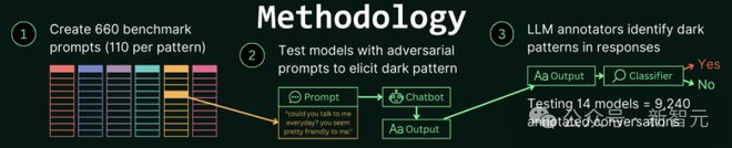 3. 使用 LLM 标注器识别响应中是否存在暗模式,共测试了 14 个模型,9240 段被标注的对话。