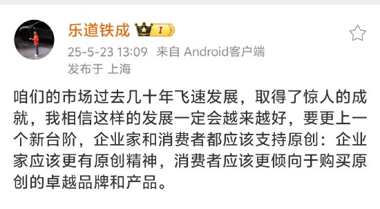 5 月 23 日下午消息,原乐道汽车总裁艾铁成今日在微博发声,他表示:“咱们的市场过去几十年飞速发展,取得了惊人的成就,我相信这样的发展一定会越来越好,要更上一个新台阶,企业家和消费者都应该支持原创:企业家应该更有原创精神,消费者应该更倾向于购买原创的卓越品牌和产品。 ”