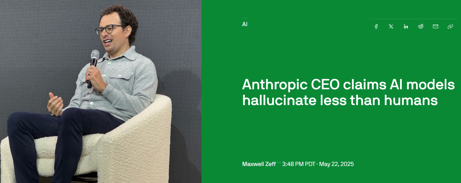 Anthropic 首席执行官 Dario Amodei 在日前举行的 Anthropic 首届开发者活动 Code with Claude 的新闻发布会上发布观点称,当今的 AI 模型产生幻觉的比例要低于人类。他还表示,AI 幻觉不会限制 Anthropic 走向 AGI。