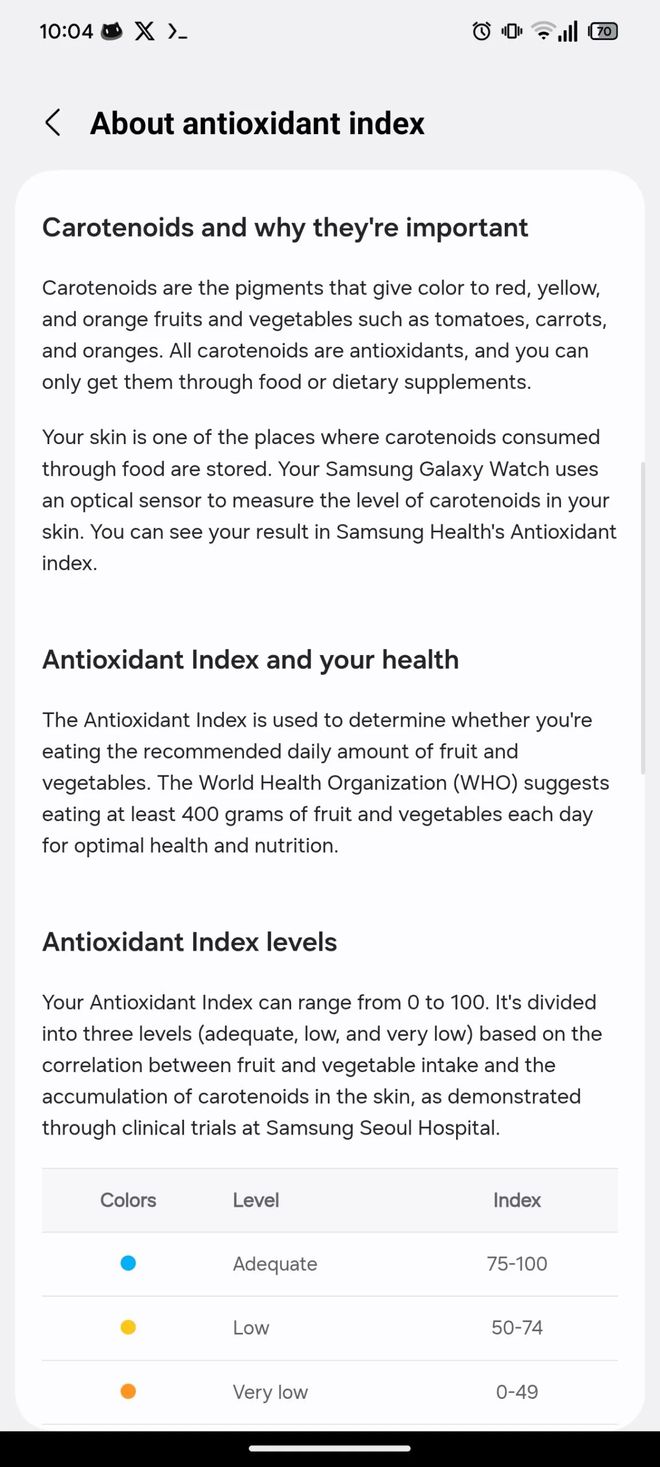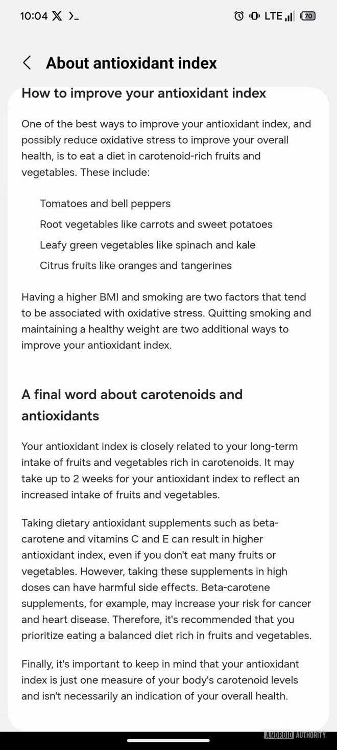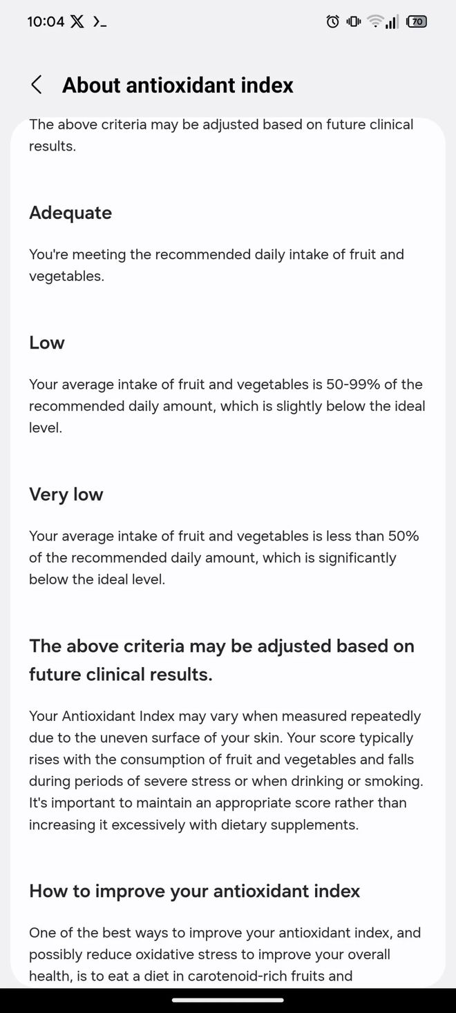 抗氧化指数功能通过测量用户体内 β-胡萝卜素水平,结合水果和蔬菜摄入量,评估抗氧化水平,输出极低(Verylow)、低(Low)、充足(Adequate)三种不同等级的结果,并分别以橙色、黄色和蓝色进行色标区分。IT 之家附上相关截图如下: