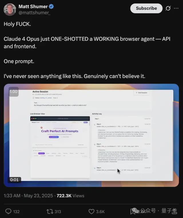 这两天大家可以说是试玩了不少,有人仅用一个提示就搞定了个浏览器 Agent,包括 API 和前端……直接一整个大震惊,与此同时关于 Claude 4 可能有意识并试图干坏事的事情同样被爆出。