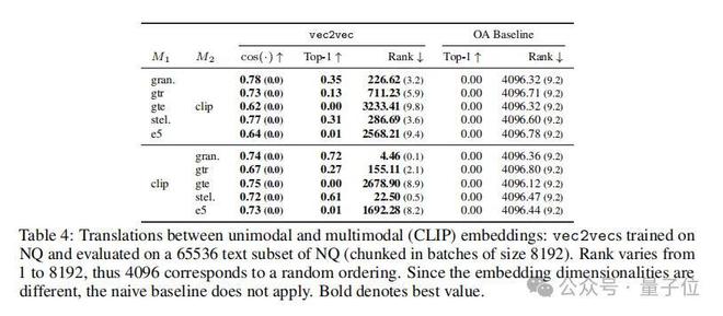 下表也验证了 vec2vec 在单模态与多模态嵌入(如 CLIP)中的转换潜力。