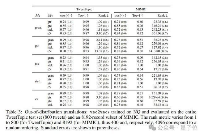 vec2vec 在分布外数据(如推文和医疗记录)上也表现稳健。例如,在 TweetTopic 上,GTE 到 Stella 的余弦相似度达 0.92,Top-1 准确率 100%。