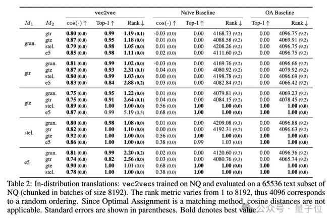 vec2vec 在目标嵌入空间中与真实向量的余弦相似度高达0. 92,并在超过8000 个随机打乱的嵌入上实现完美匹配,揭示了所有编码器在不同架构或训练数据下都拥有几乎相同的表示形式。