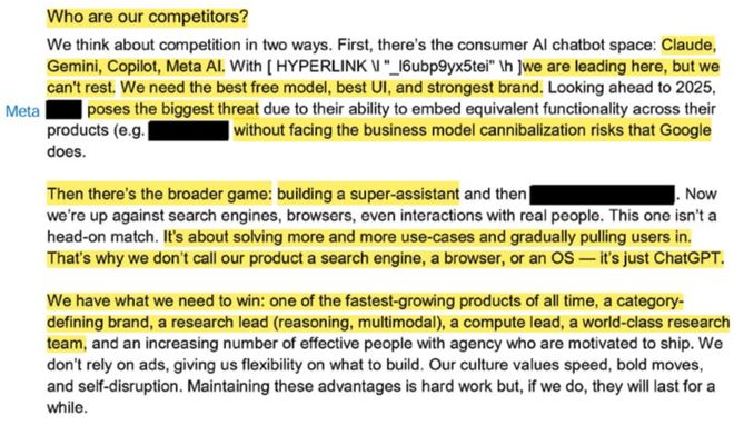 文件隐晦提到,一个科技巨头(社区推测为苹果或者 Meta)被视为 OpenAI 的最大威胁。