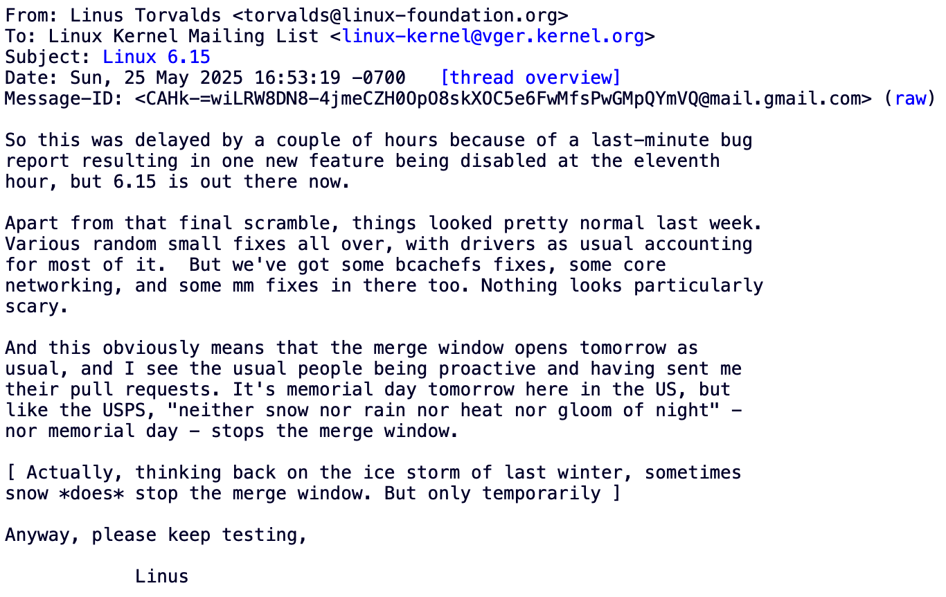 Linus 表示,由于最后一刻递交的 bug 报告,6.15 内核的发布推迟了数小时,结果是一项新功能被禁用。