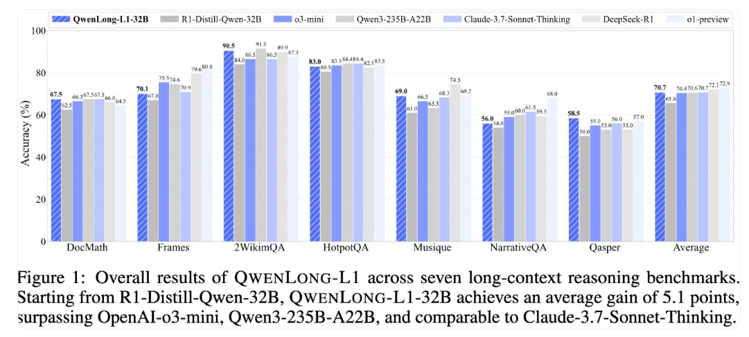 在七项长上下文问答(DocQA)基准测试中,QwenLong-L1-32B 展现了非凡的实力。其性能不仅超越了 OpenAI 的 o3-mini 模型和阿里巴巴自家的 Qwen3-235B-A22B,甚至接近了 Claude-3.7-Sonnet-Thinking 的水平。这一成绩彰显了阿里巴巴在长上下文推理领域的深厚技术积累。